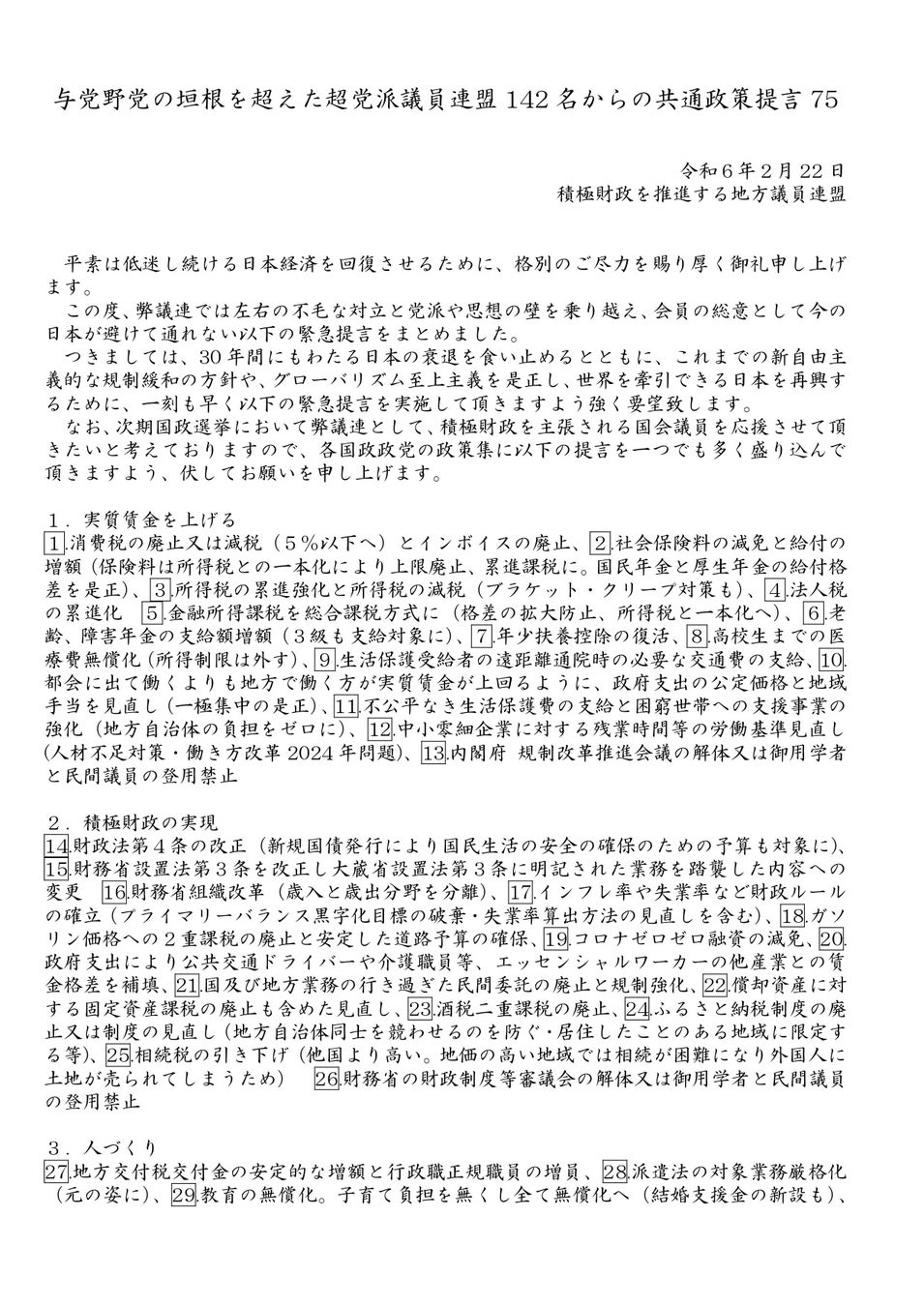 ■与党野党の垣根を超えた超党派議員連盟144名からの共通政策提言75