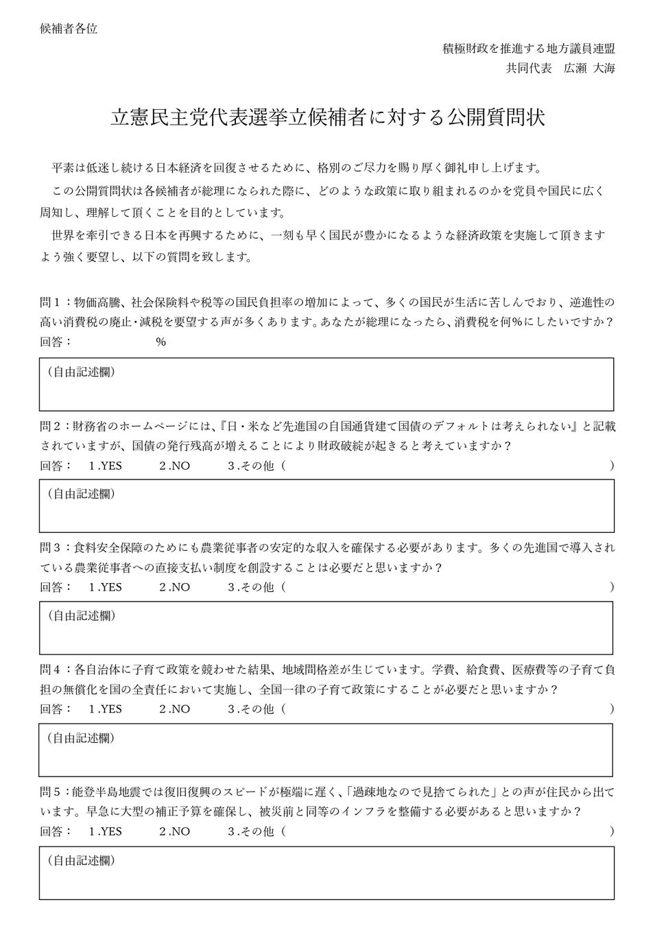 この公開質問状は各候補者がどのような政策に取り組まれるのかを両党員や国民に広く周知し、理解して頂くことを目的としています。