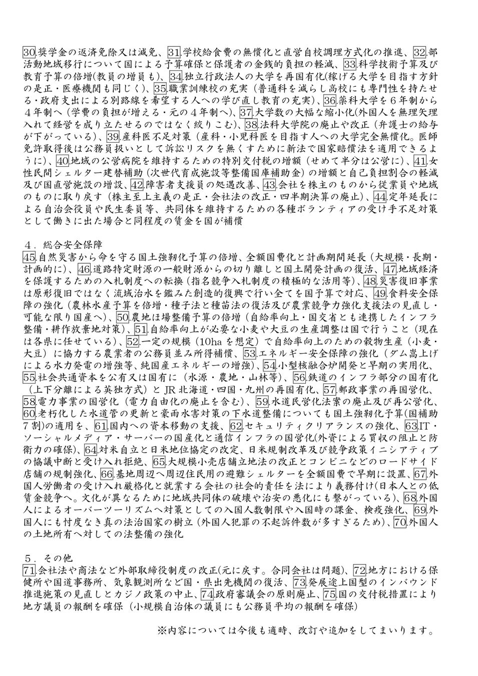 また、今年2月に「与党野党の垣根を超えた超党派議員連盟144名からの共通政策提言75」を公表しましたが、今後行われる国政選挙において、提言書の内容を一つでも多く政策集に取り入れて頂きたいと思い、全ての候補者へお渡しいたします。