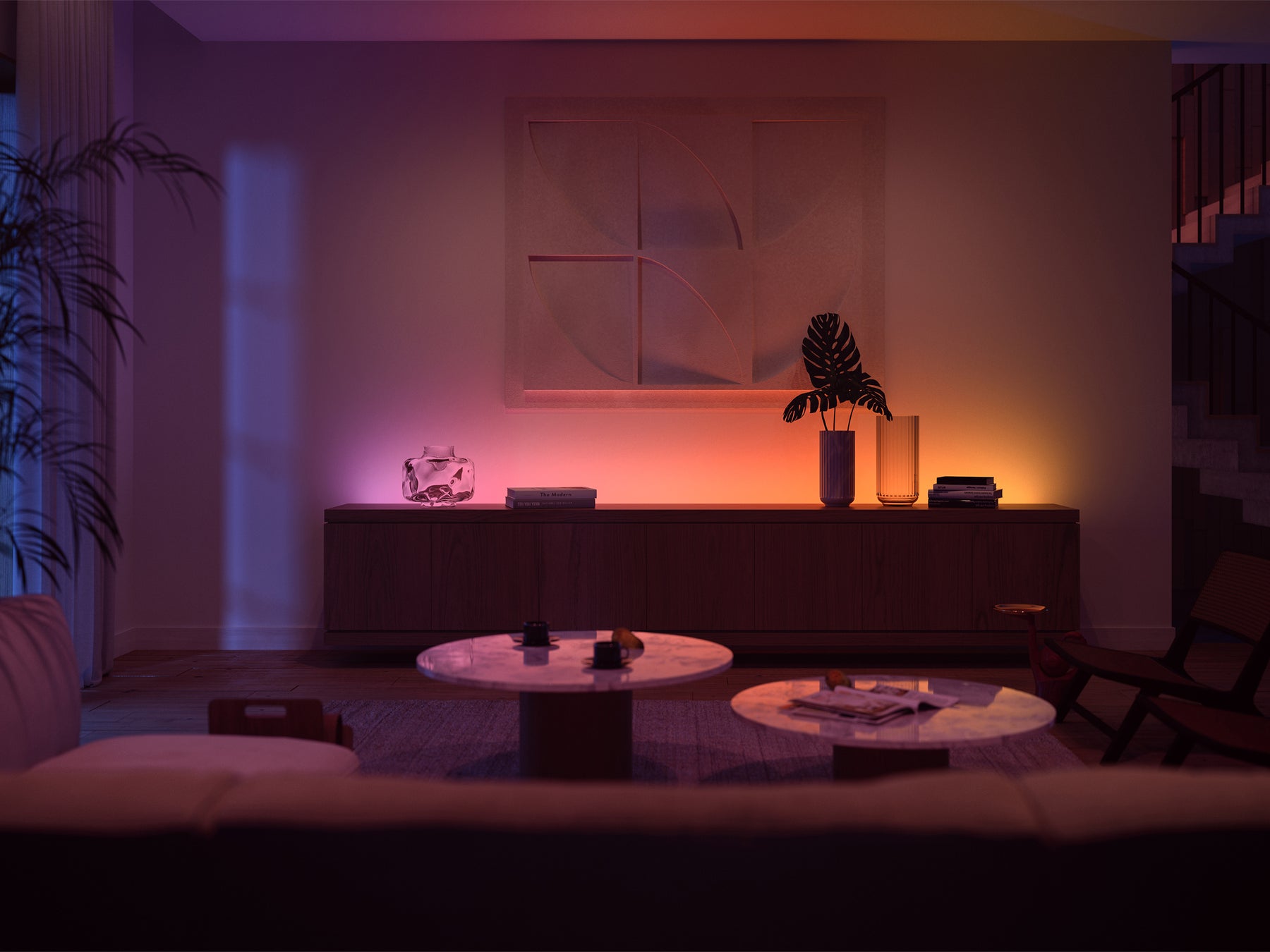「Hue グラデーション ライトリボン」は、1本で複数の発色ができるリボン状のスマート照明です。専用アプリで指定した色をなめらかなグラデーション*1で発色できるため、お部屋の雰囲気をより華やかに演出します。棚下やソファー下、ベッドのヘッドボードなどに使用することで、ご家庭をホテルライクな空間へと格上げするのに効果を発揮します。