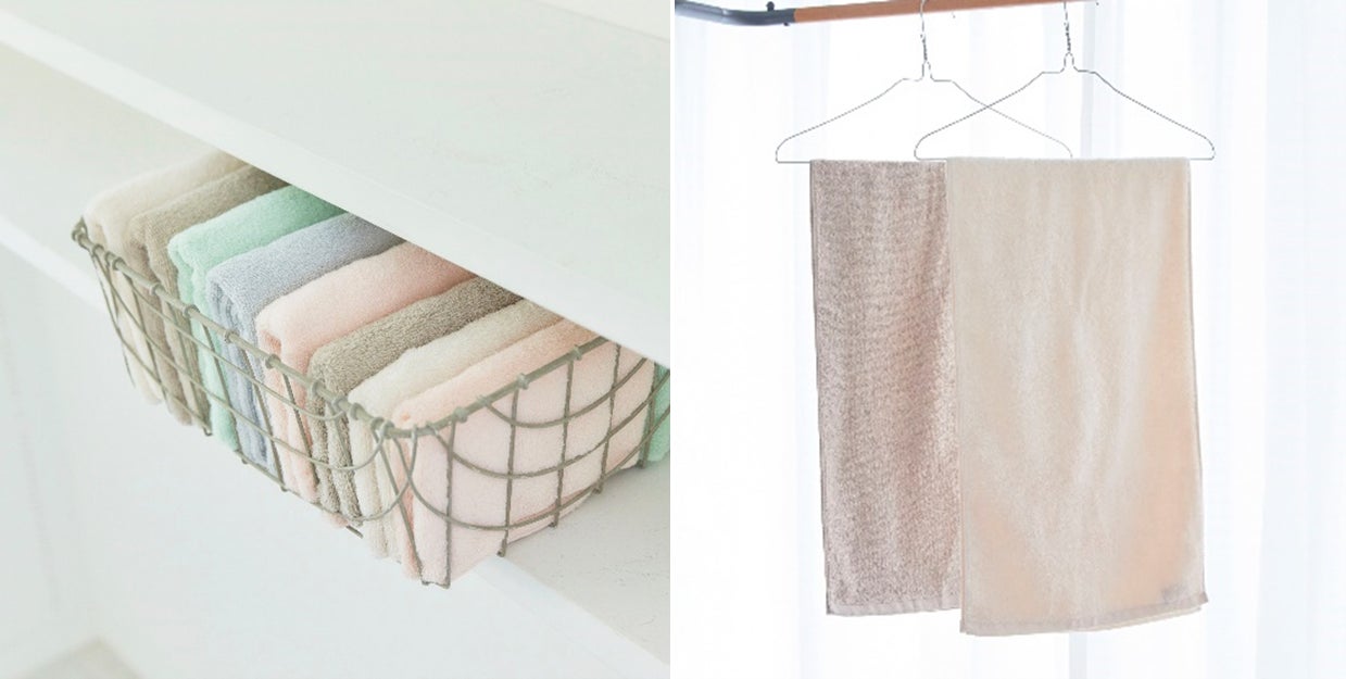 従来の一般的なサイズより幅が狭く長さが短いコンパクトサイズのバスタオルとフェイスタオルを、ニュアンスカラーで展開。バスタオルでもハンガーに掛けて干すことができるので、物干しの際にも収納時においても場所を取らず省スペースを実現できる、当社初の取り組みです。