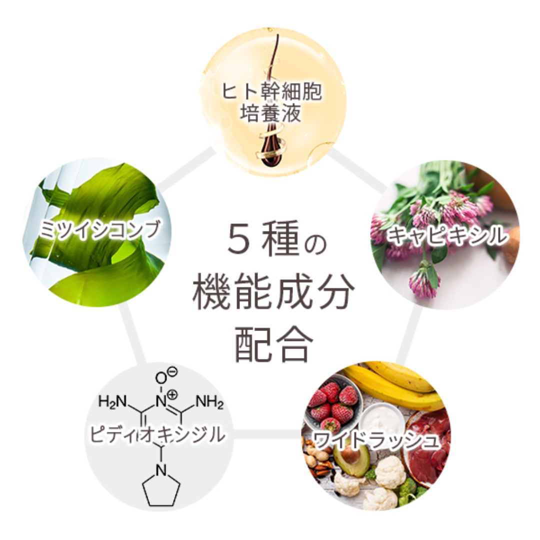 本製品は、医・薬・毛髪の専門家と共同開発した、抜け毛の予防や発毛促進効果が示されている医薬部外品5成分、毛髪を作るアミノ酸5種以上をバランスよく配合し、育毛にアプローチできるよう成分設計しています。