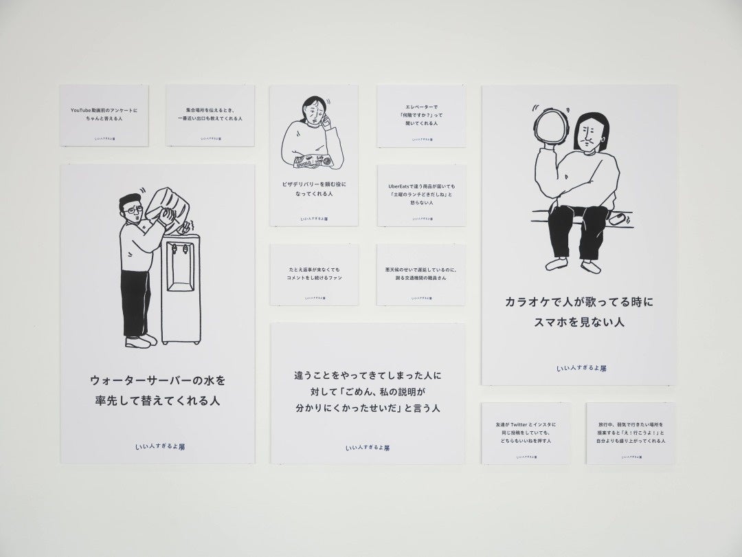 2023年6月に、「集合写真で中腰の人」や「電話なのにお辞儀してる人」などの日常に潜むいい人を集めた『いい人すぎるよ展』を初開催するとチケットが即完売となり、大きな反響を呼びました。その後2023年10月に『いい人すぎるよ展+やだなー展 2nd Season』を開催するとSNSで共感を呼ぶ投稿が相次ぎ、16日間で25,000人を動員。老若男女問わず幅広い方々にご来場いただきました。
