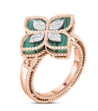 <ロベルトコイン>のピンクゴールドは、「ピーチカラー」と呼ばれ、このゴールドの色味でファンになる方も少なくありません。中央に配された可憐な4粒のダイヤモンドが絶妙なアクセントになっています。