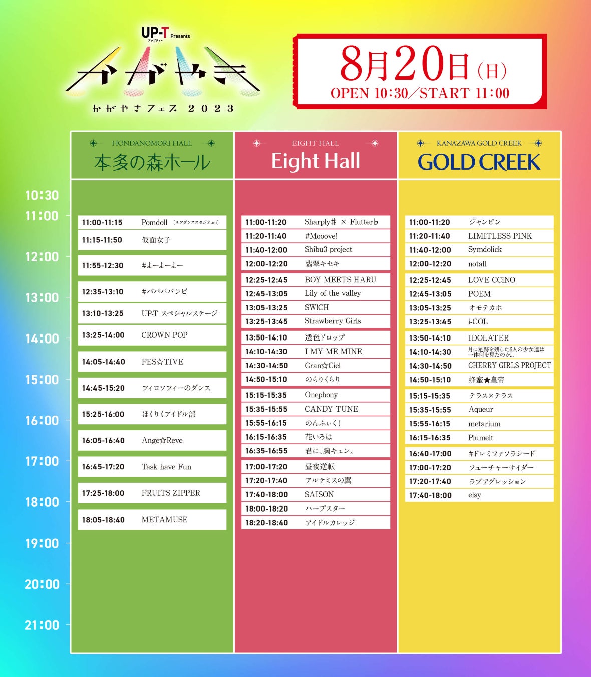 8月19日(土)・20日(日)でメイン会場の「本多の森ホール」とライブハウス会場の「Eight Hall」・「GOLD CREEK」の各出演時間とステージを発表いたします!※特典会詳細は後日発表