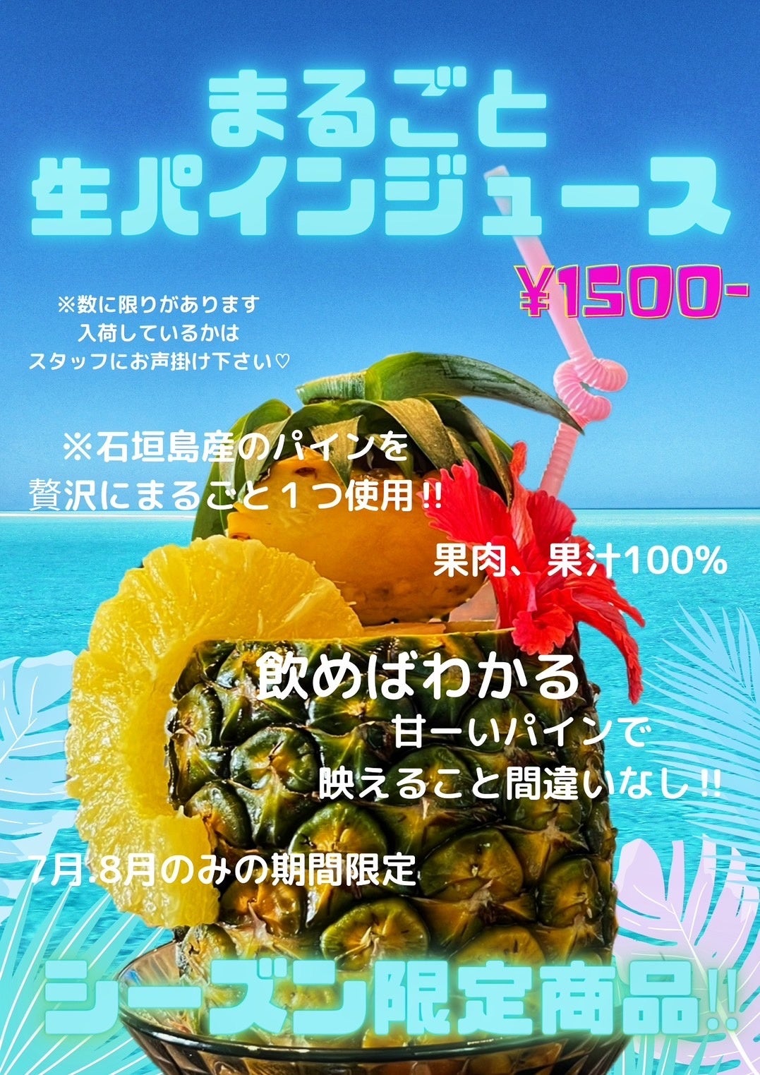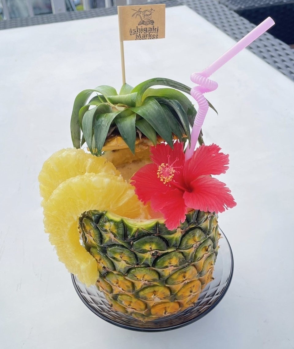 石垣島産のパイナップルを丸ごと1つ使用した生パインジュースが新登場!飲みごたえ満点、味良し、香り良し、写真写りも抜群の一品です☆農家直送の生パインを使用しているため、1日の販売個数に限りがございます。詳しくは当店スタッフまで♪
