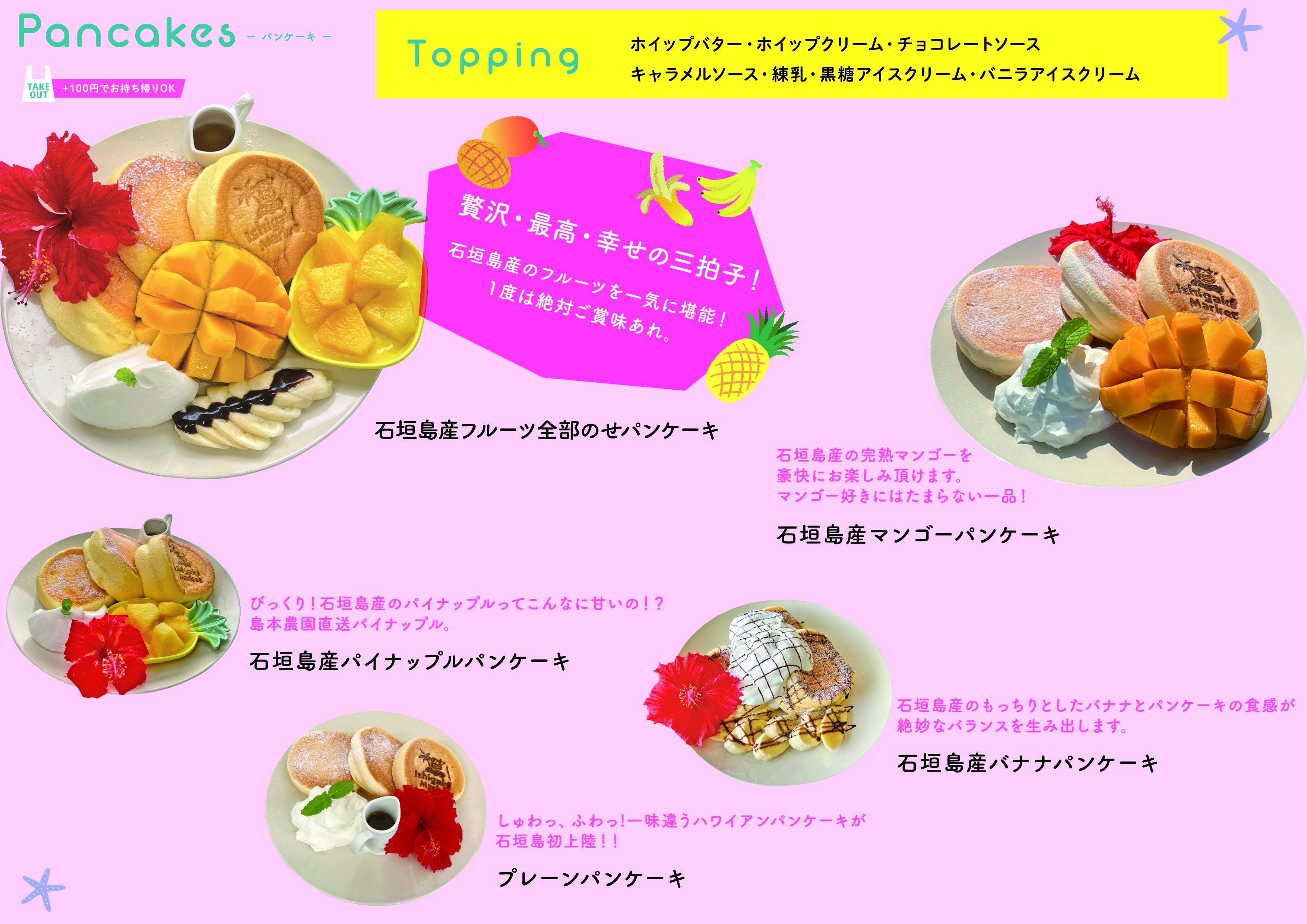 当店看板メニューの「ふわしゅわパンケーキ」が朝食メニューでもお楽しみいただけます。石垣島産フルーツとの相性も抜群の一品です。他では味わえない新食感の「ふわしゅわパンケーキ」と「甘くてみずみずしい石垣島のフルーツ」を是非ご賞味ください。