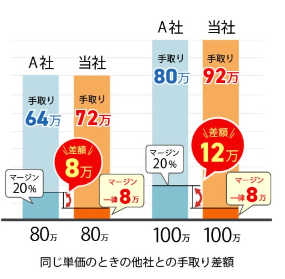 業界のマージン(仲介手数料)は15~40%と言われていますが、当サービスではマージンを一律8万円で統一しています。