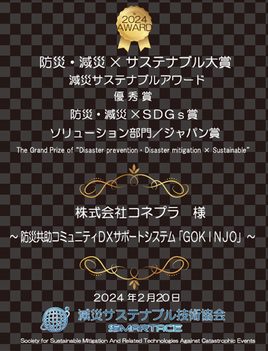 株式会社コネプラ(本社:東京都千代田区、代表取締役社長:中村 磨樹央、以下コネプラ)は、同社が企画・開発・運営をする、防災共助コミュニティDXサポートシステム「GOKINJO」が、減災サステナブル技術協会が主催する防災・減災×サステナブル大賞2024 減災サステナブルアワード にて優秀賞【防災・減災×SDGs賞 ソリューション部門/ジャパン賞】を受賞しましたことをお知らせいたします。