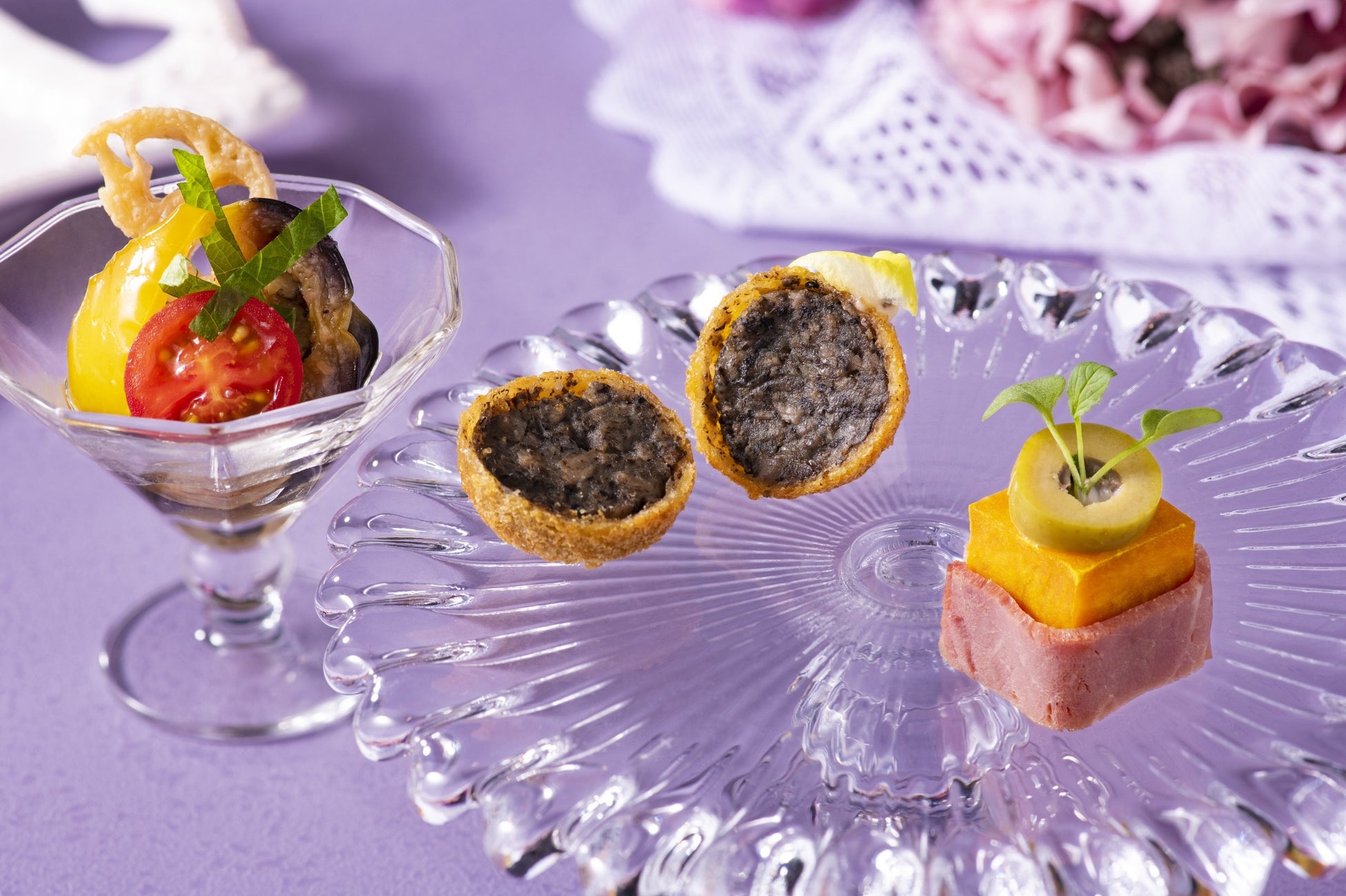 ~真っ黒なホタテチップを添えたズワイガニのサラダや、黒トリュフをふんだんに使用したセイボリーも~