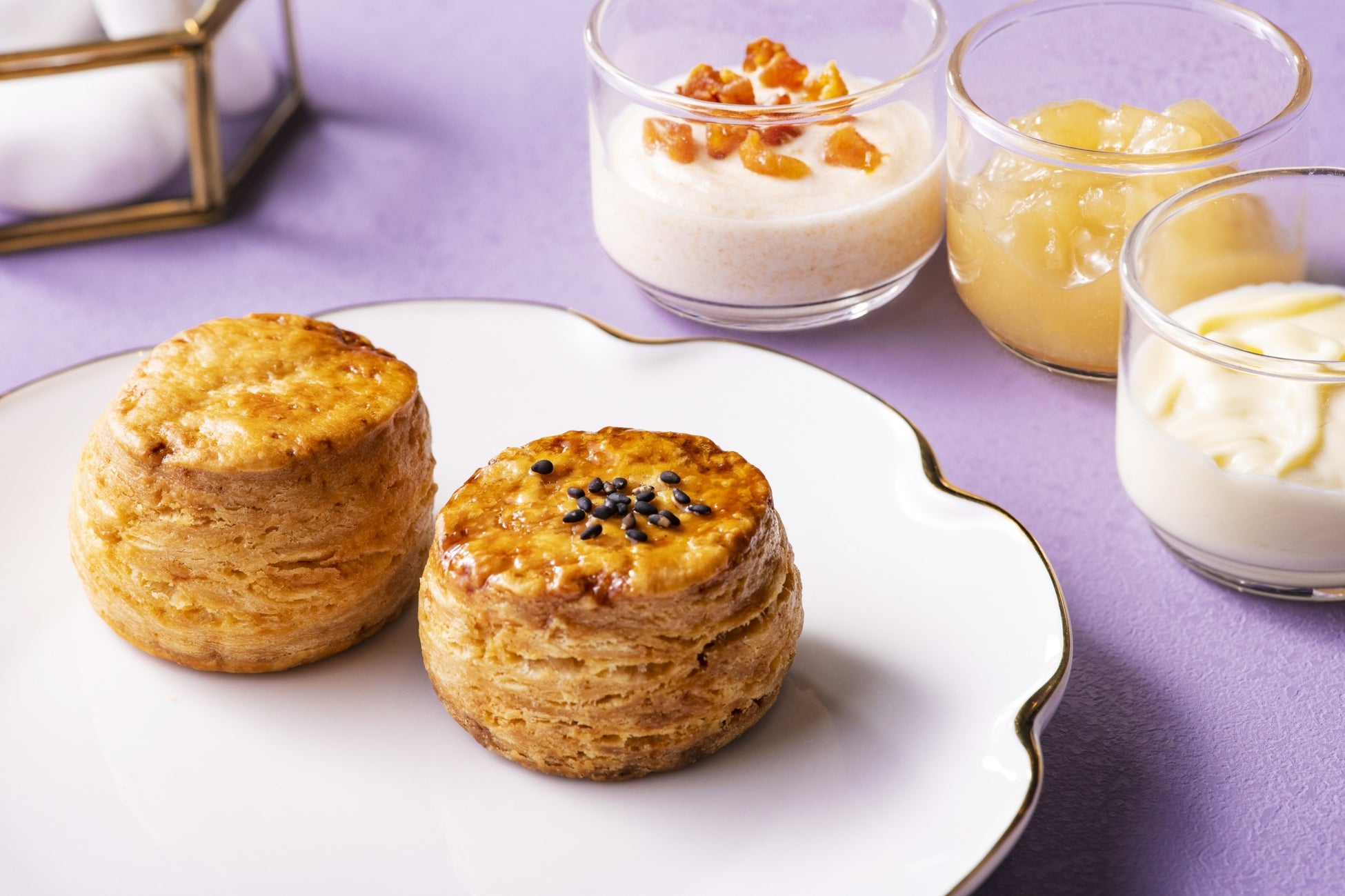 外はサクッと中はしっとりとしたスコーンは、バターたっぷりのプレーンに加え、大学芋味の2種類をご用意しました。大学芋スコーンには、さつまいもパウダーを練り込んで焼き上げた生地に、醤油ベースの甘じょっぱいタレを塗りました。トップに散らした、黒ゴマの香ばしさがアクセントです。コンディメントには、クロテッドクリームの他、和梨とノンアルコールの白ワインを合わせた爽やかな後味のジャムと、北海道産マスカルポーネの味わいの中に、富有柿の甘さが引き立つクリームをご用意しました。スコーンとコンディメントはお好きな組み合わせでご賞味ください。