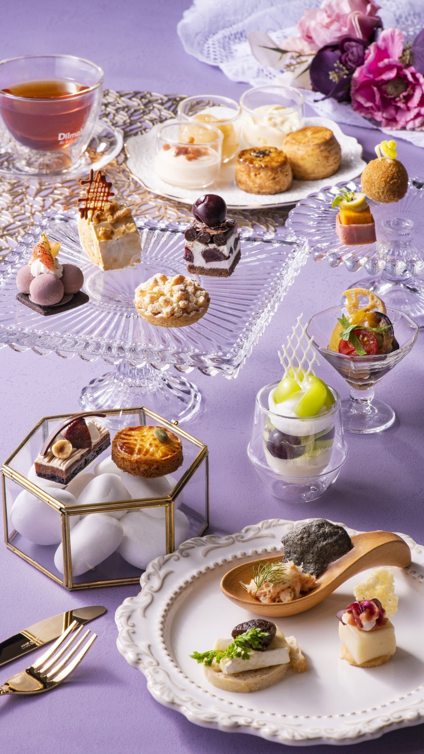 セイボリーには、真っ黒なホタテのチップを添えたズワイガニのサラダや、生ハムとパルメザンチーズの塩味がアクセントの洋梨のパンナコッタ、黒トリュフをふんだんに混ぜ込んだクロケットなど、全6種類が登場します。