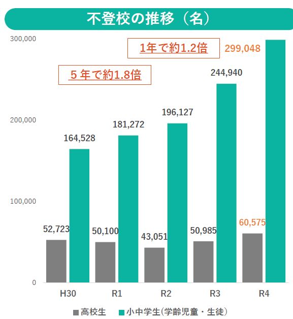 「まなび フリースペース」開校の背景にあるのは全国的な不登校児童の増加です。令和4年度の調査によると、全国の不登校児童は約30万人。前年に比べて5万人以上、増加をしています。府中市や近隣自治体でも不登校児童が増加しており、公的な支援に加えて民間での支援の拡充が求められています。