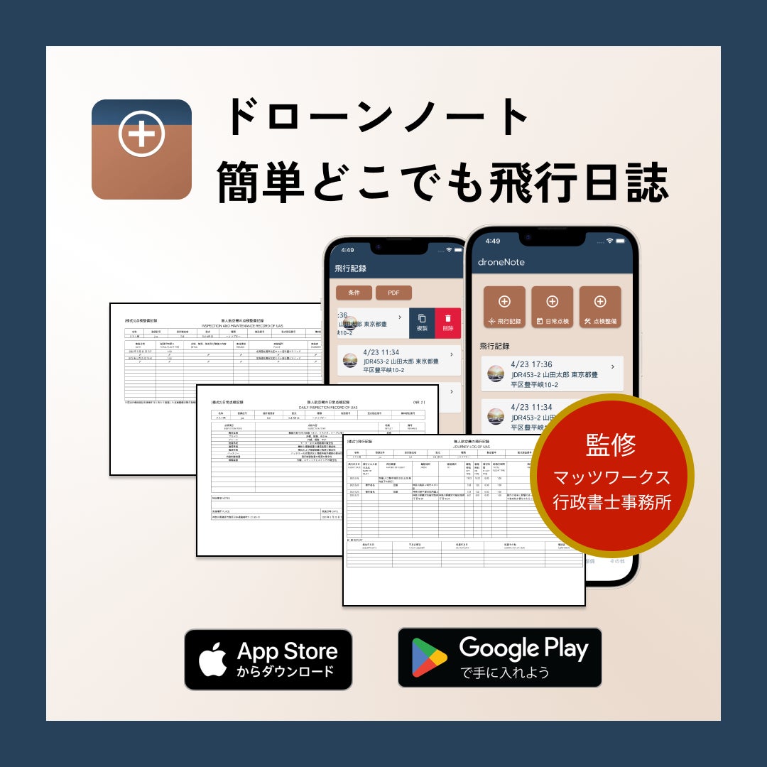 「ドローンノート」は国土交通省の要件に準拠する飛行日誌作成支援アプリです。スマートフォンアプリの持つ操作体験のメリットを最大限に活かし飛行日誌の作業負担軽減を図ります。マッツワークス行政書士事務所の監修による安心感と、無料のライトプランにて「①データ登録数無制限」「②飛行日誌への画像登録」「③自動バックアップ・他端末とデータ連携」が出来るため利便性に優れています。