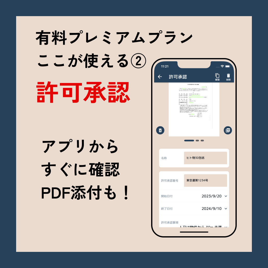 9月20日のアップデートではプレミアムプラン(初回7日間無料お試し後、月額 500円)の機能拡充を行い、飛行日誌以外の遵守事項を支援する飛行管理機能の強化を行いました。「遵守事項チェック」では国土交通省作成の「無人航空機標準飛行マニュアル」や「無人航空機の飛行の安全に関する教則」をベースにしたチェック項目を手動で入力することで自己点検を促します。遵守事項そのものは利用者の要件に応じてカスタマイズすることが可能です。「許可承認」では国土交通省発行の「無人航空機の飛行に係る許可書(承認書)」の内容をアプリに入力し必要な準備を行ったことを確認できます。PDFの添付により発行書類の閲覧も可能です。