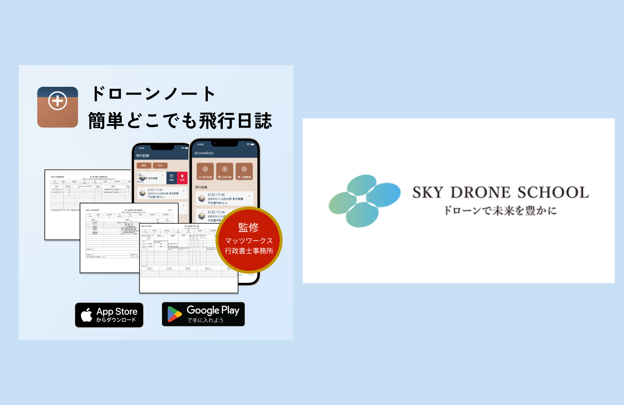 ドローン飛行日誌アプリ「ドローンノート」を手掛けるシャイニー・エー合同会社とJUIDA認定「SKYドローンスクール」を運営する株式会社アイペックが業務提携を発表