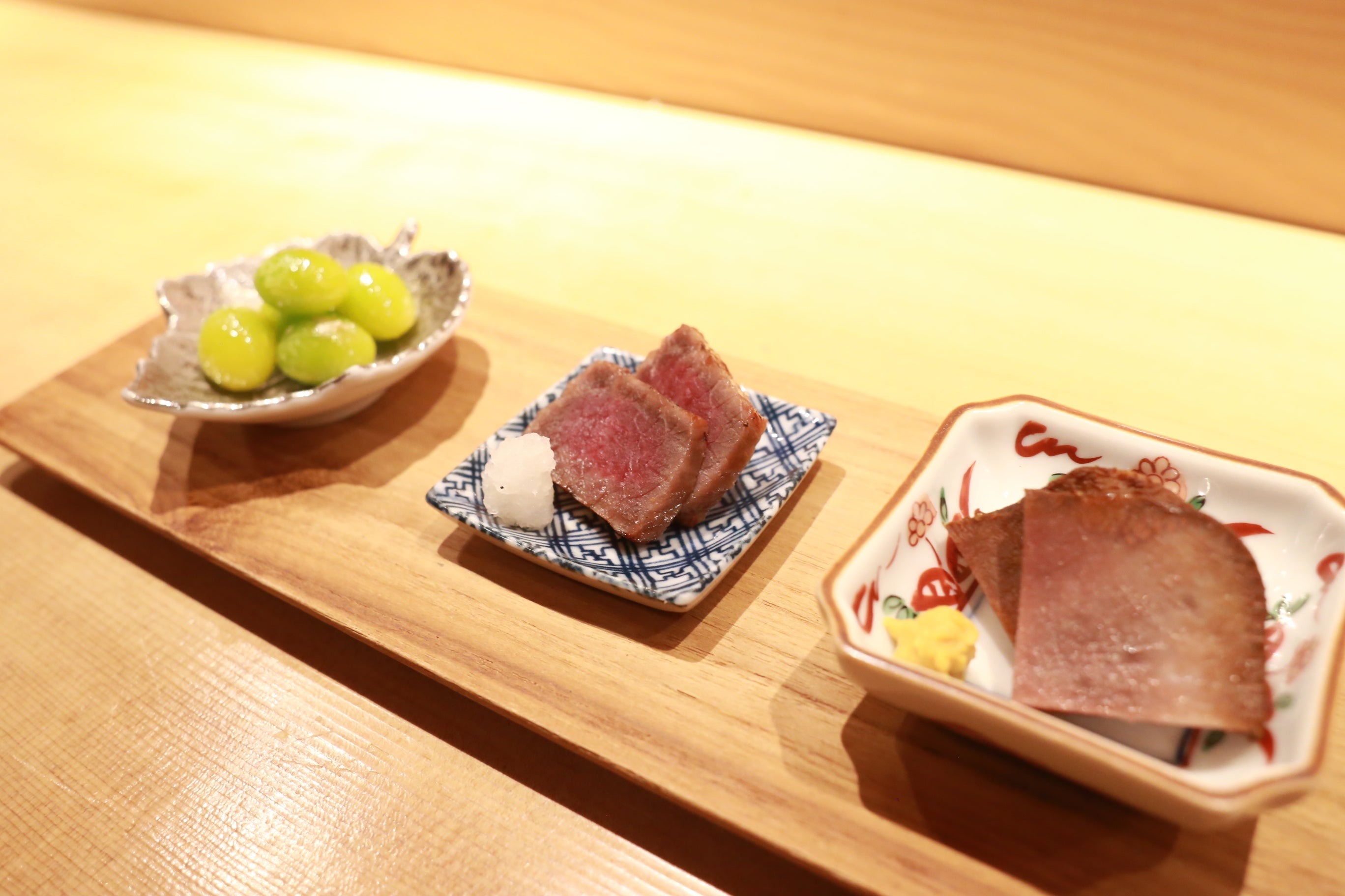 ・前菜:牛タン味噌漬け/和牛西京漬け/銀杏の塩和え