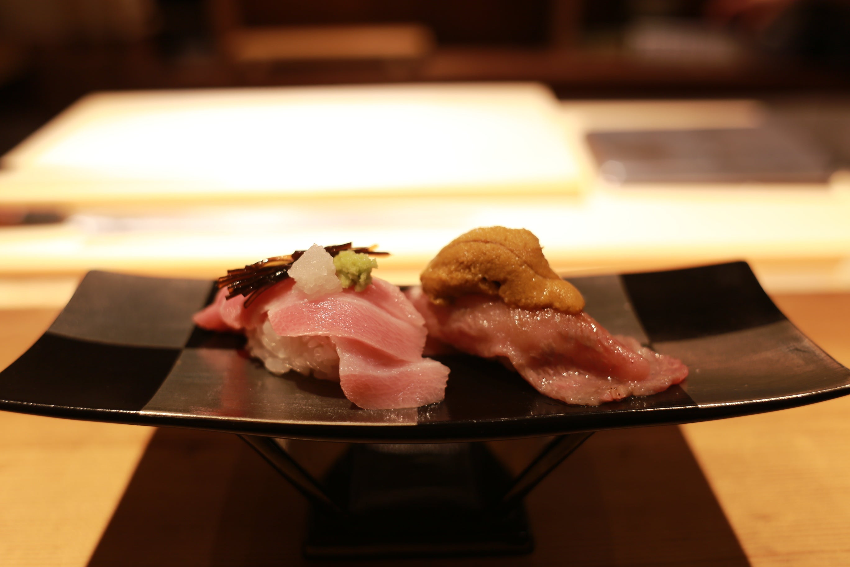 ・二皿:寿司 和牛炙り雲丹のせ/大トロまぐろ