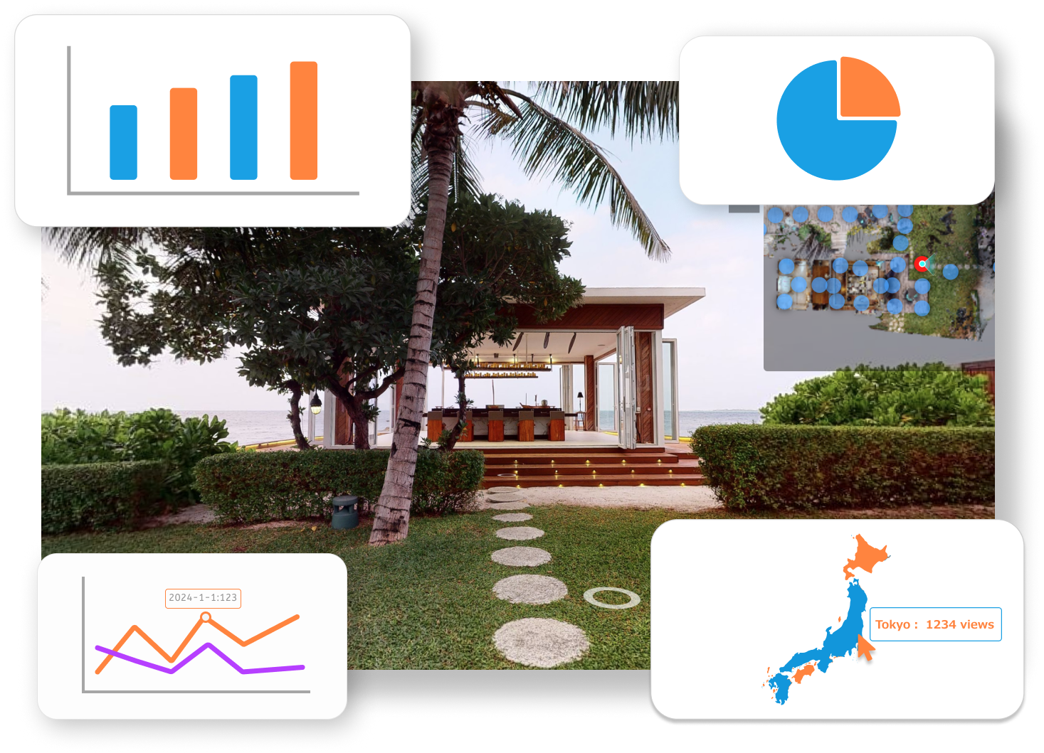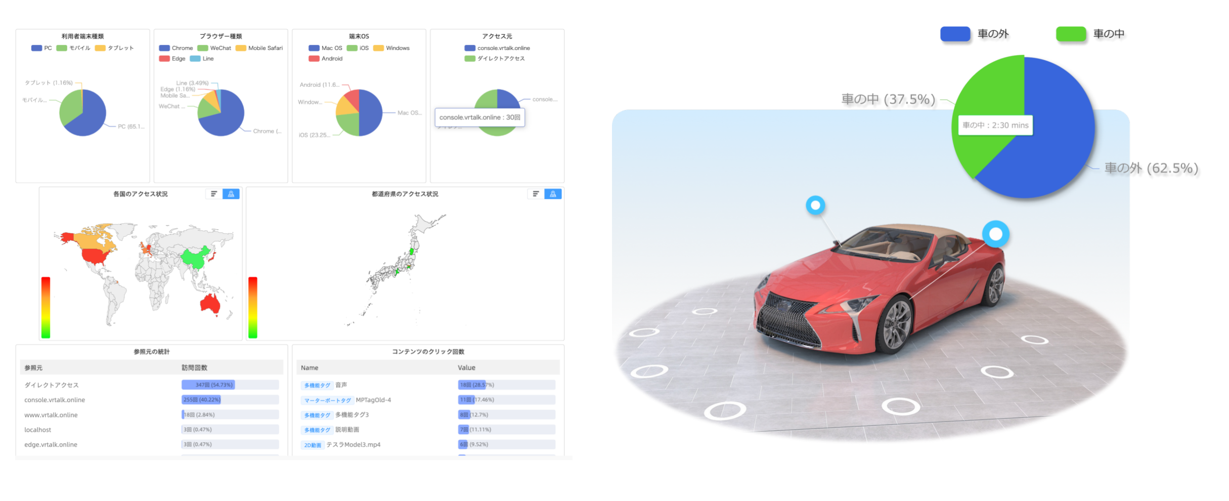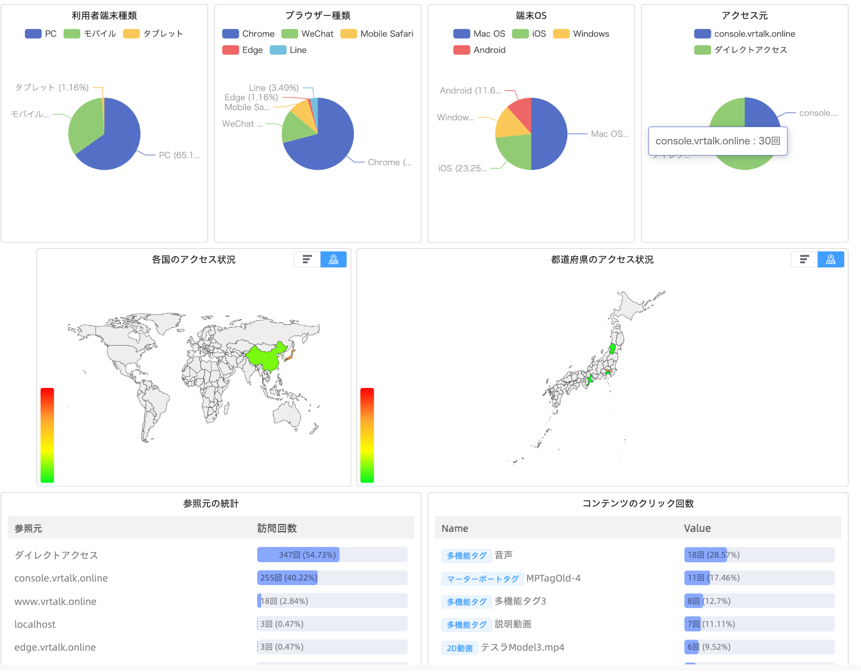 VRTalkが独自で開発した行動分析ツールでは、VRのアクセス回数、訪問者数、IP数、VRヒートマップなどの基本の統計データだけでなく、国内の都道府県別のVR訪問状況も統計できますし、世界各地の訪問回数も集計できます。また、VR内に設置されたホットスポット、動画、画像などのデータがクリックされた回数も全て集計されます。会社のビジネス要件に応じて、データ分析の統計ルールをカスタマイズし、会社のニーズにぴったり合った、全面的なデータ統計を行うことができます。統計内容はURLを生成して顧客に送信するという便利機能もあります。行動分析機能を利用して、VRの使用状況をより深く理解し、VR空間を通じて普段では取得できないデータを収集し、顧客の行動をさらに深く分析することができ、会社の製品販売戦略作成に役立ちます。