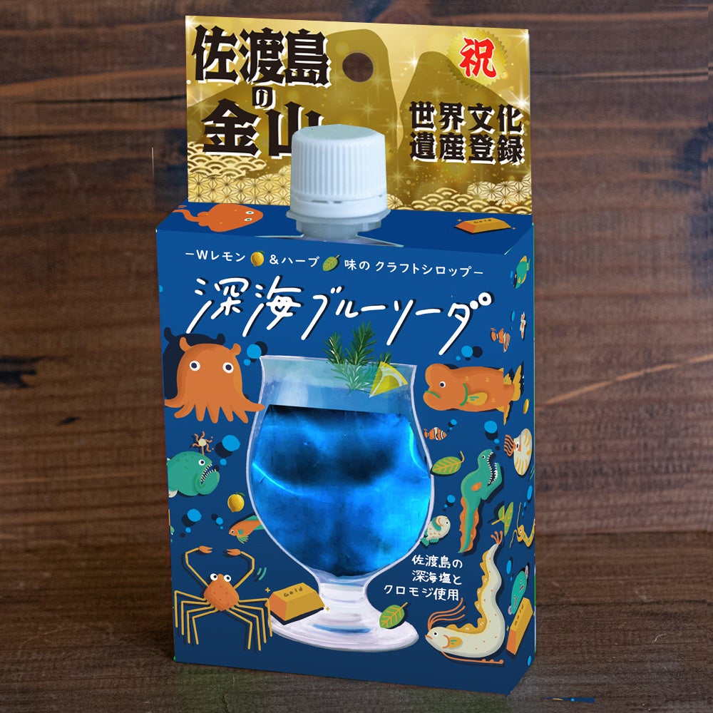 佐渡島のクラフトシロップシリーズ第1弾商品「深海ブルーソーダシロップ」は、佐渡産の深海塩と和ハーブ(クロモジ)を使用。クロモジ・レモン・レモングラスをベースにした深みのある落ち着いたハーブの味わいと深い青が好評のクラフトシロップです。
