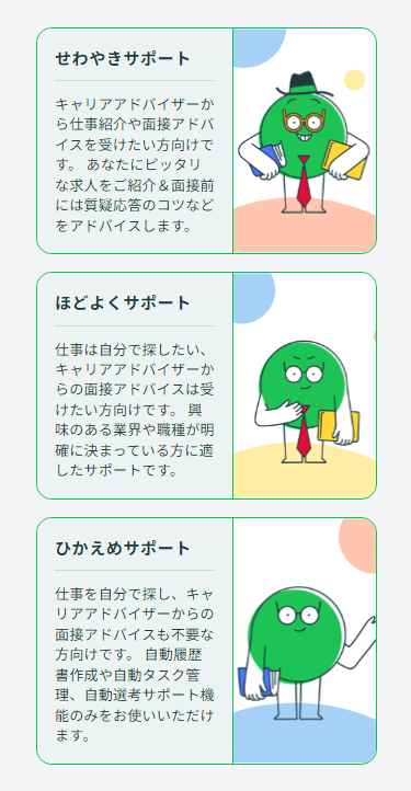 求職者はそれぞれのニーズに合わせて、サポートタイプを選ぶことができます。
