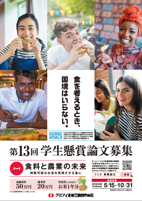 私たちクミアイ化学工業は、世界の食料・農業を支える企業として、未来を担う学生の皆さんと一緒になって、食や農業に関する問題を考え、持続可能な社会の実現に向けて事業活動を行っていきたいと考えています。2012年からは食農教育を目的に「学生懸賞論文」の募集を行っており、本年も、これからの食や農業に対して夢あふれる自由で大胆なアイデアや提言をいただきたいと思います。第13回となる本年は、『食料と農業の未来-持続可能な社会を実現させる為に-』をテーマとして「学生懸賞論文」を募集いたします。