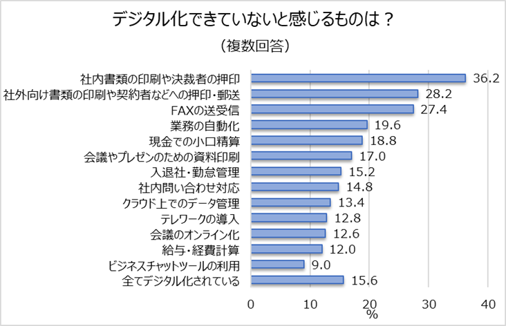 デジタル化ができていないものについては「社内書類の印刷や決裁者の押印(36.2%)」に最も多くの票が集まりました。「社外向け書類の印刷や契約者などへの押印・郵送(28.2%)」、「FAXの送受信(27.4%)」にも約3割の票が集まり、ペーパーレス化が実現できていない企業もまだまだ多いことが分かりました。一方、「全てデジタル化されている(15.6%)」と、デジタル化が進んでいる職場も一定数あるようです。