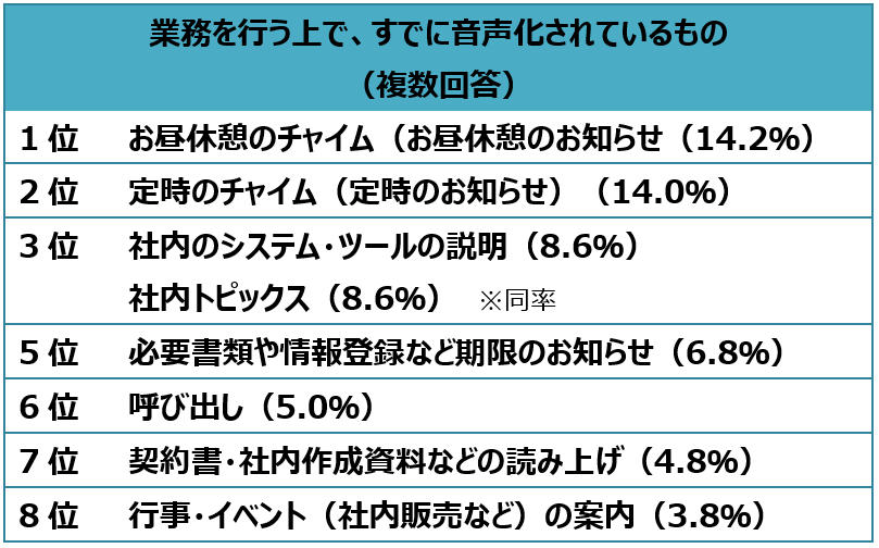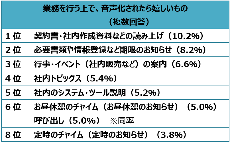 音声化されたら嬉しいものについても質問。1位は「契約書・社内作成資料などの読み上げ(10.2%)」がランクイン。次いで「必要書類や情報登録など期限のお知らせ(8.2%)」、「行事・イベント(社内販売など)の案内(6.6%)」という回答が続きました。