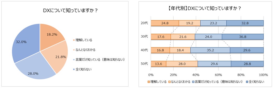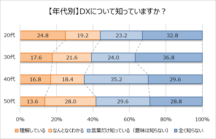 デジタルトランスフォーメーション(以下、DX)への取り組みが必要とされている現代。DXとは、企業がビジネス環境の激しい変化に対応し、データとデジタル技術を活用して、顧客や社会のニーズを基に、製品やサービス、ビジネスモデルを変革するとともに、業務そのものや、組織、プロセス、企業文化・風土を変革し、競争上の優位性を確立することです。まず、そもそもこのDXについて知っているか理解度を調査しました。「理解している(18.2%)」と回答した人は2割未満で理解度が低いことが分かりました。「なんとなくわかる(21.8%)」は約2割、「言葉だけ知っている(意味は知らない)(28.0%)」は約3割でした。約3人に1人が「全く知らない(32.0%)」と回答。言葉を聞いたことがある人が多いものの、DXについてあまり浸透していないことが分かりました。年代別で見ると、「理解している人」は20代が最多で24.8%でした。一方、理解度が一番低かったのは50代で13.6%でした。
