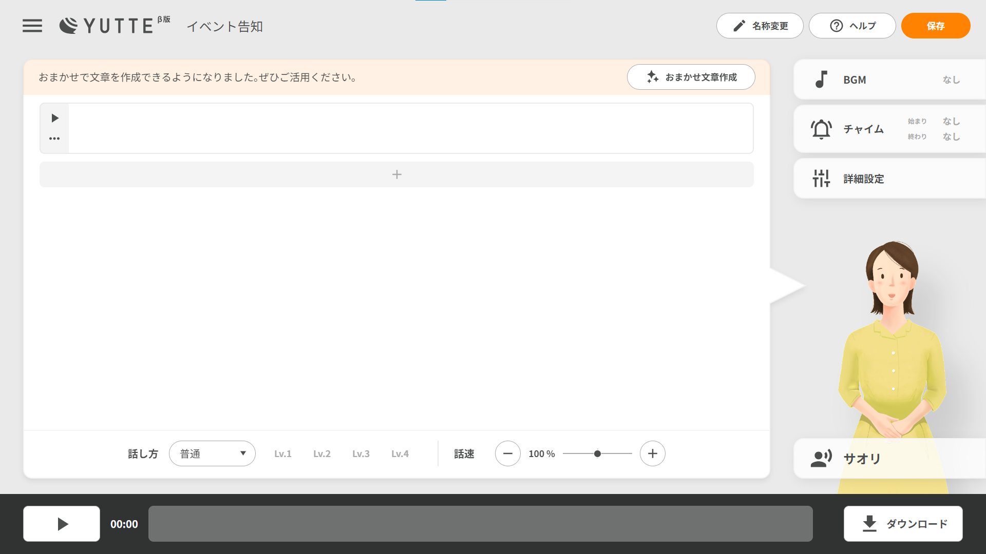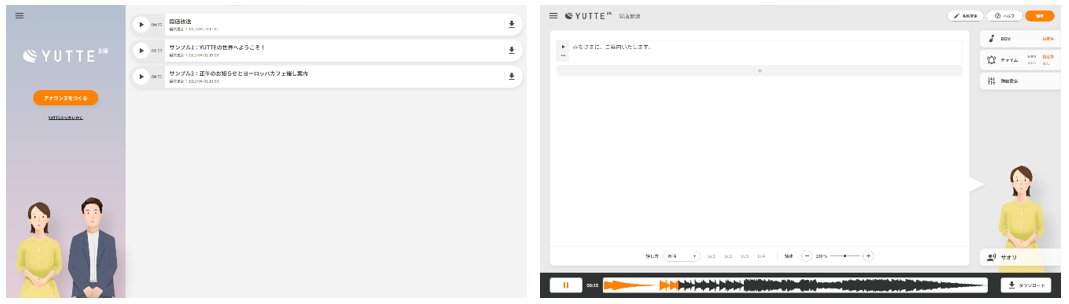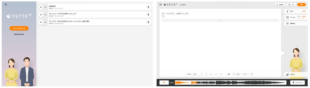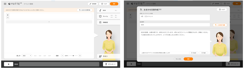 音響機器を扱うTOA株式会社が今年から提供を開始した放送アナウンス作成サービス「YUTTE」は、PCに文章を入力するだけで放送アナウンス音源を簡単に作れるサービスです。話者の性別、感情、抑揚のレベルなど合計26パターンから選べ、チャイムやBGMなどを付加することが可能。公共施設やイベント会場、公共交通機関、スーパーを含む商業施設など、アナウンスを流す場所に応じて、音声をカスタマイズできます。