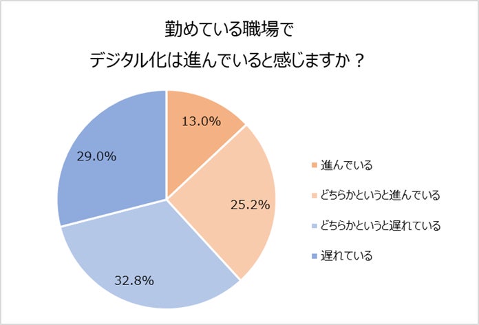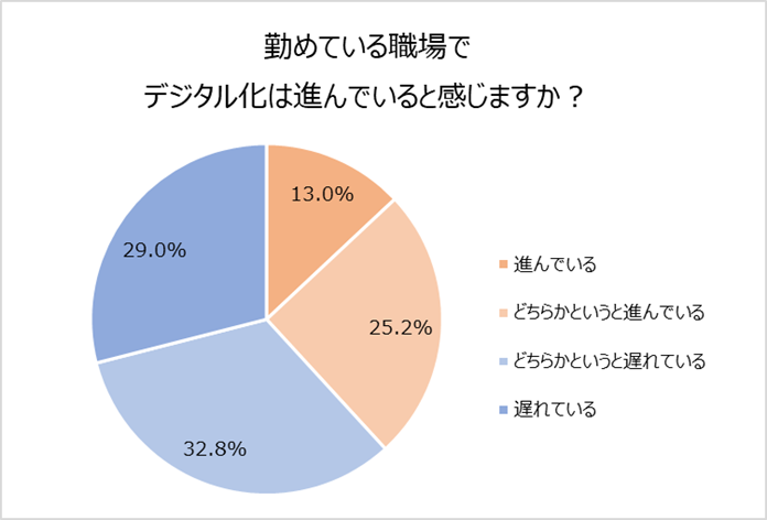 続いてデジタル化について質問しました。デジタル化とはアナログで業務していたものを、デジタルを活用した業務に変更することで、DXを実現するのに必要なIT化を進めるための1つの方法です。デジタル化が「進んでいる(13.0%)」、「どちらかというと進んでいる(25.2%)」と回答した人は4割近くいました。一方、約6割の人が務める職場では、デジタル化が遅れているという実態も明らかとなりました。デジタル化が進んでいると感じる理由として、ペーパーレス化やリモートワーク、会議のオンライン化などの声が多く寄せられました。デジタル化が遅れていると回答した人からは、経営層の理解度が十分ではないことや、まだまだペーパーレス化が進められていないこと、取引先のやり方に合わせているといった声が寄せられました。