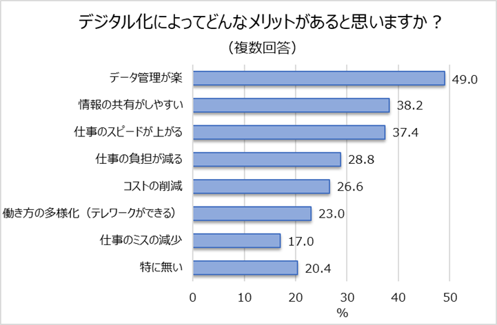 デジタル化によってどんなメリットがあると思うか質問したところ、「特に無い(20.4%)」という人を除く約8割の人が何かしらのメリットがあると感じていることが分かりました。1位は「データ管理が楽(49.0%)」と約半数の人が回答。次いで2位には「情報の共有がしやすい(38.2%)」、3位には「仕事のスピードが上がる(37.4%)」がランクインしました。