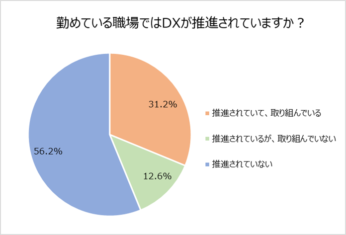 DXへの取り組みについて、勤めている職場で推進されているか質問したところ、約3割の人が「推進されていて、取り組んでいる(31.2%)」と回答。一方、半数以上の人が「推進されていない(56.2%)」と回答し、DXが進んでいない職場が多いことが見て取れます。「推進されているが、取り組んでいない(12.6%)」は一定数おり、なかなか取り組みを実現できていない職場もあるようです。