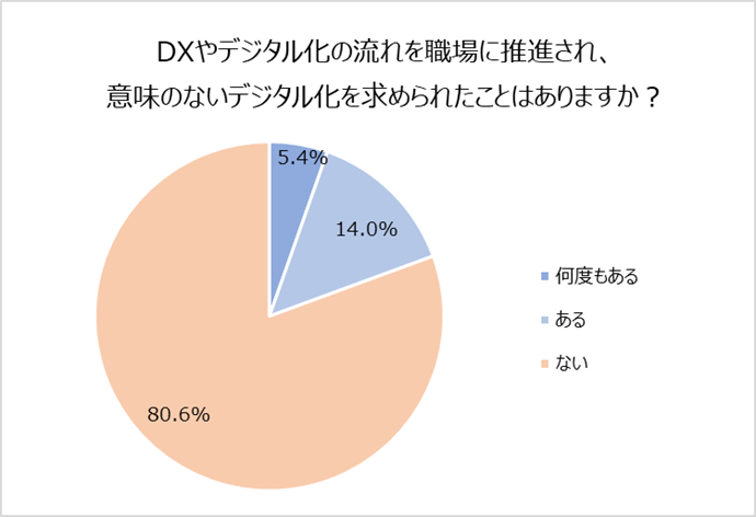 メリットがあると感じている人が多いことが分かりましたが、DXやデジタル化の流れを職場に推進され、意味のないデジタル化を求められた経験があるか質問したところ、約5人に1人が「何度もある(5.4%)」、「ある(14.0%)」と回答。職場のデジタル化は、社員にとって良い形で進められていない部分もあることがうかがえます。