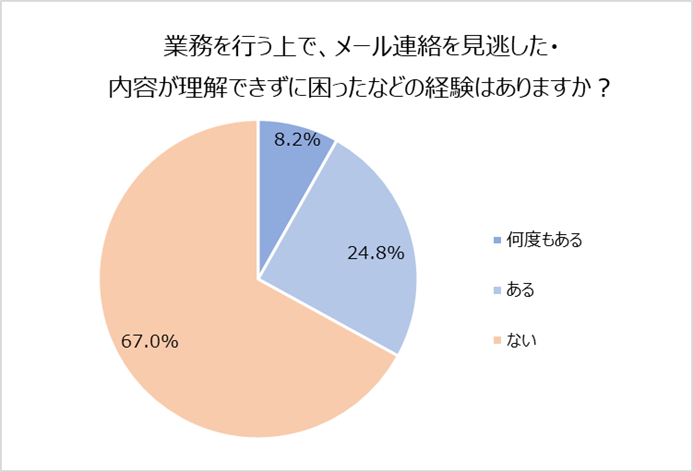 業務を行う上で、メールでの連絡であったため、気付かなかった・理解できずに困った経験がある人は「何度もある(8.2%)」、「ある(24.8%)」を合わせて、約3人に1人いることが分かりました。