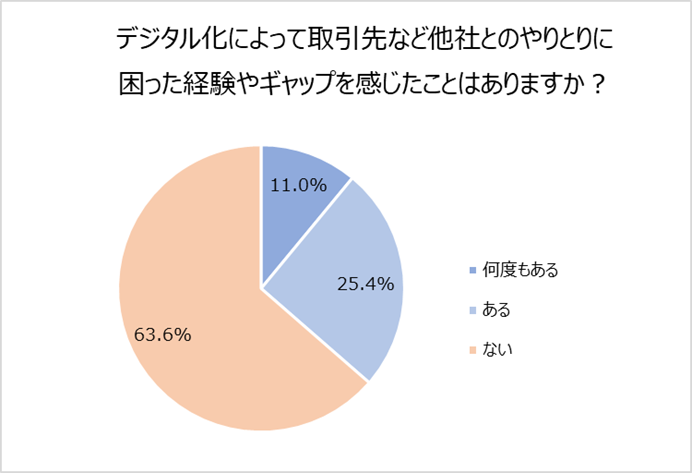 デジタル化できていないもの2位にランクインした「社外向け書類の印刷や契約者などへの押印・郵送」。取引先に合わせてアナログまたはデジタルで対応している職場もあるのではないでしょうか。デジタル化によって取引先など他社とのやりとりに困った経験やギャップを感じたことがあるか質問したところ、「何度もある(11.0%)」、「ある(25.4%)」と、3人に1人以上が回答しました。