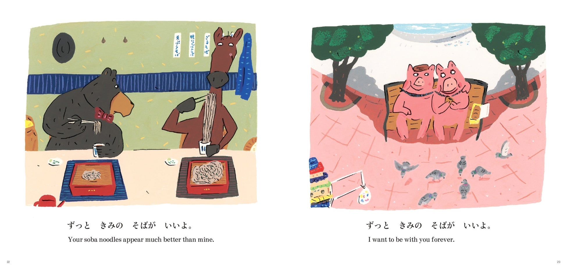 ○おなじフレーズで展開するのに、こんなに違うストーリー? 短い日本語のことばと一緒に、くま紳士とブタたち、それぞれのゆかいな1日が同時に進んでいく、ポップな絵本です。