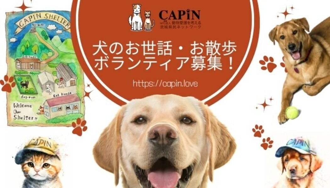 認定NPO法人CAPIN(茨城県)は、保護犬のお散歩ボランティアを新規募集します。初心者や学生、シニアの方も歓迎。月1回~週3回の活動で、犬猫の命を守るお手伝いができます。