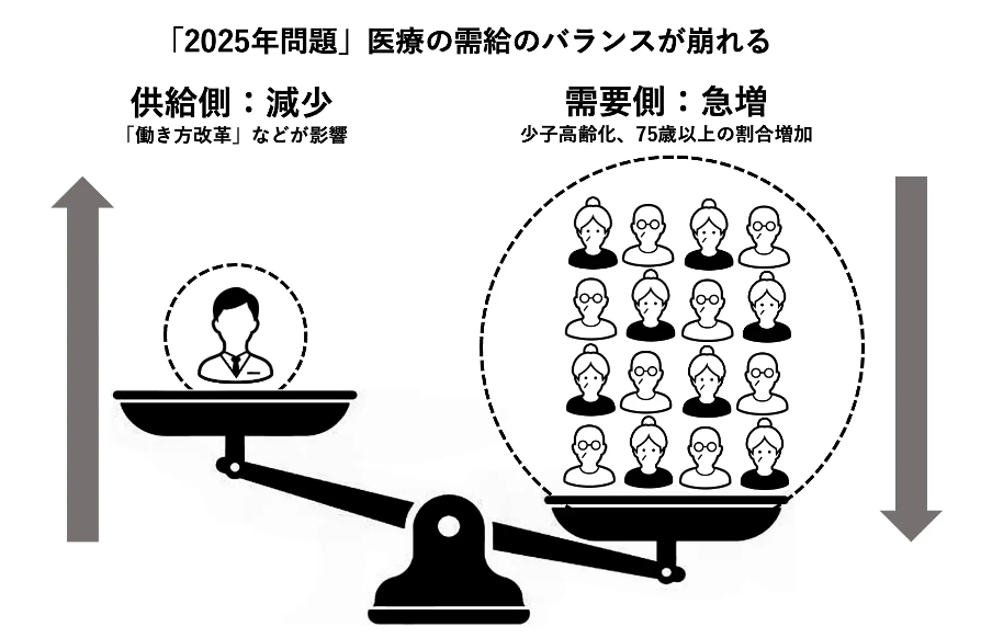 理由は、少子高齢化のなかでも大きな影響を持つ団塊の世代の年齢と働き方改革のタイミングです。2019年に施行された「働き方改革を推進するための関係法律の整備に関する法律(通称、働き方改革関連法)」の主な目的の一つが「長時間労働の慢性化」問題の解消でした。医療業界は長時間労働・過重労働が慢性化していると言われてきた業界で、多分に漏れず働く環境の改善=過重労働をなくすことが急務とされています。つまり医療供給量の減少が予測されます。一方で、2024年〜2025年にかけて、団塊世代が75歳を超えて医療を受けたい人の数は増加。医療需要量の増加が予測されています。