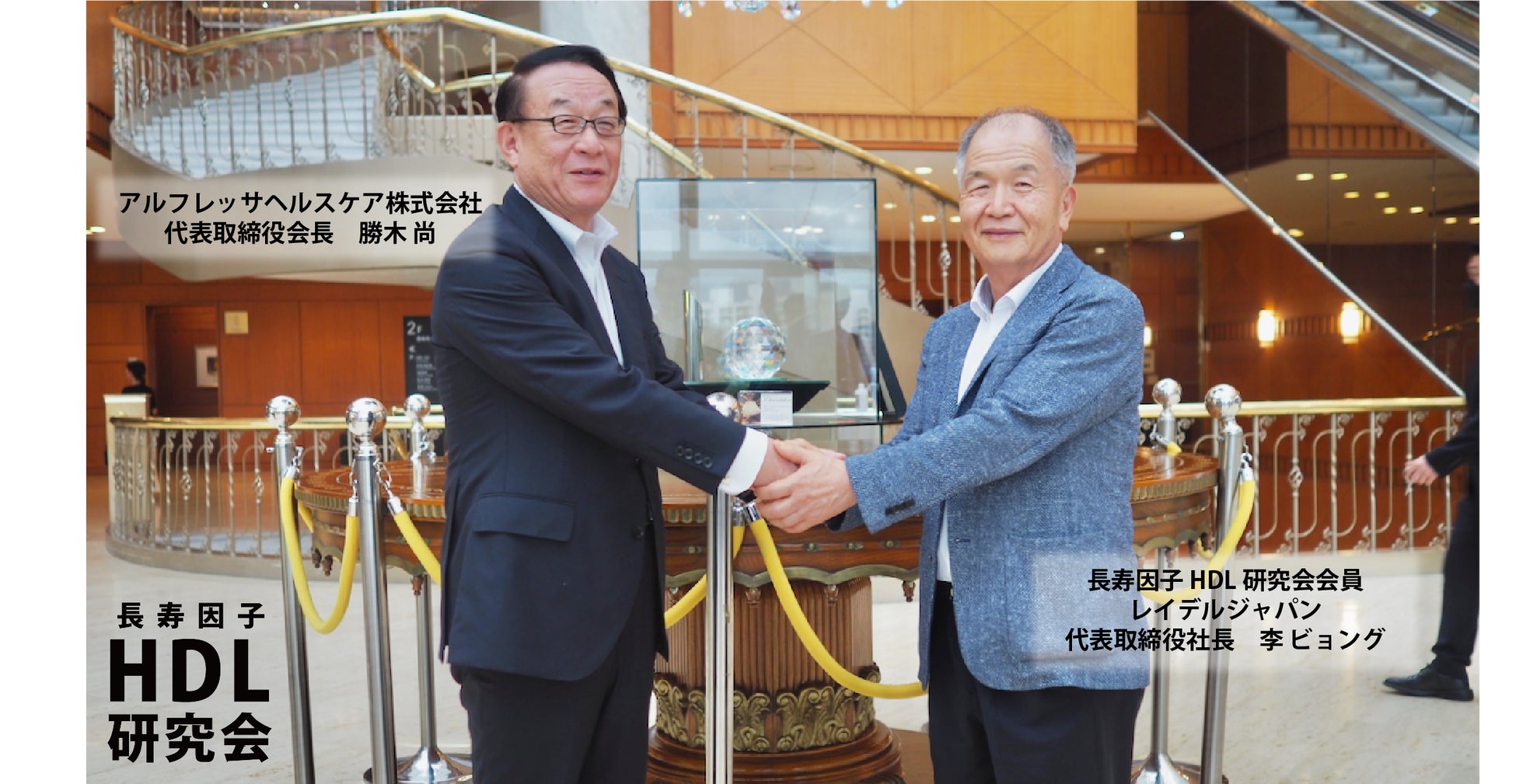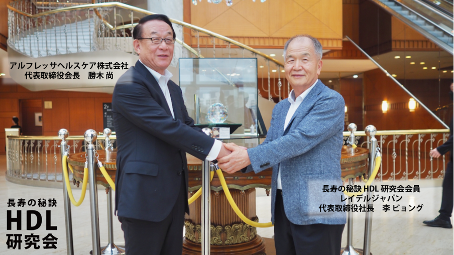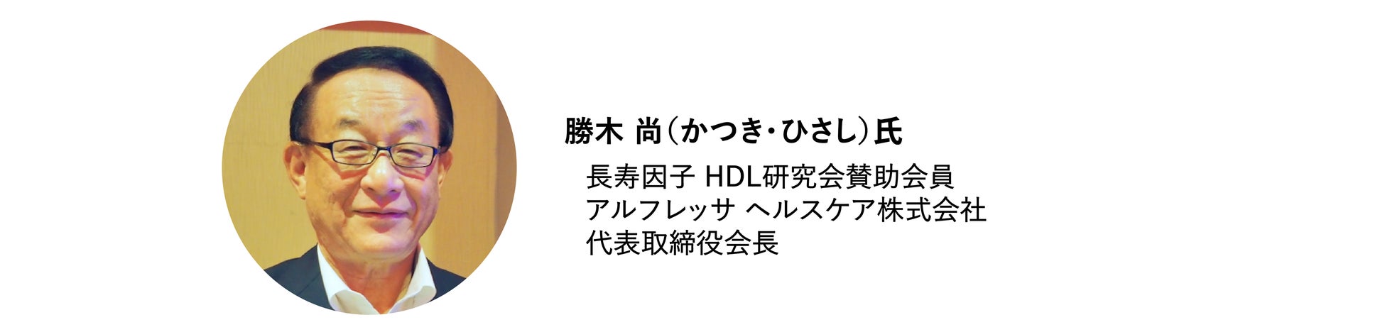 この度、アルフレッサHC勝木会長と「長寿因子 HDL研究会」の、人々の健康寿命を伸ばすためには、疾患が悪化する前の「未病・予防」対策が重要であるという理念と、人々の血圧系疾患予防に深く関わることが世界で立証され始めているHDLの重要性を社会に広めていくべきだという思いの共鳴により、今回の参画に至りました。