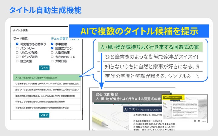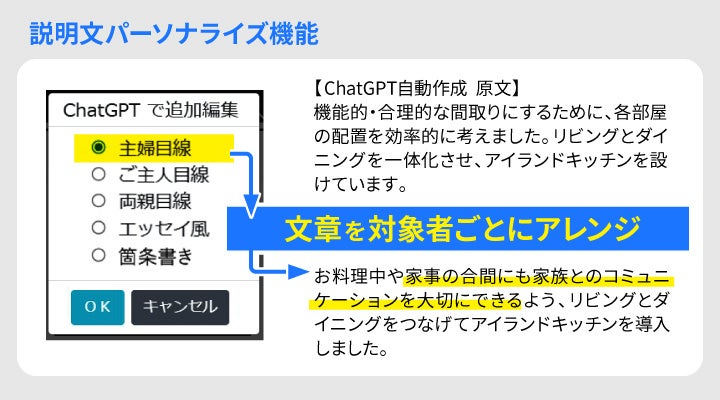 今回「マイホームロボ」に新たに導入される機能は、プランの紹介文をChatGPTで一度作成した後に、さらに“主婦目線” “ご主人目線”といったより具体的な対象者向けに掘り下げた文章を追加生成する「説明文パーソナライズ機能」と、プランの特徴に合わせて提案タイトルの候補を自動抽出する「タイトル自動生成機能 」です。