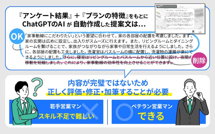 理由は、「マイホームロボ」は難しい命令文を書かなくても住宅プランを選ぶだけでChatGPTで生成した提案文が作成できること、そしてベテランにはAIが自動作成した提案文を個々のお施主向けに短時間で修正できる知見とスキルがあるからです。残念ながらChatGPTとの連携機能で生成される説明文は完璧ではありません。これは冒頭のAI inside㈱の調査にあった「回答結果の正確性に懸念があるからAIを使わない」という回答からもわかります。そのため、それを的確な文章に修正するための知見とスキルが不足している若手営業パーソンはあまり活用できていないのです。