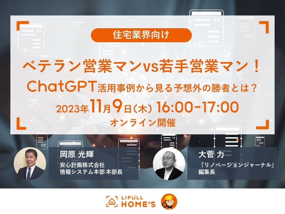 これら「マイホームロボ」の新機能の詳細や、工務店の規模に応じた活用の戦略について、11/9にLIFULL HOME'Sが主催するセミナーで詳しくご説明いたします。「ベテラン営業vs若手営業! ChatGPT活用事例から見る予想外の勝者とは?」というテーマで、マイホームロボの開発責任者と建築ライターの大菅様とでトークセッションを実施いたします。建築業界で生成AIの活用を検討中の皆様に有益な情報をご提供できるものと思いますので、ぜひご参加ください。