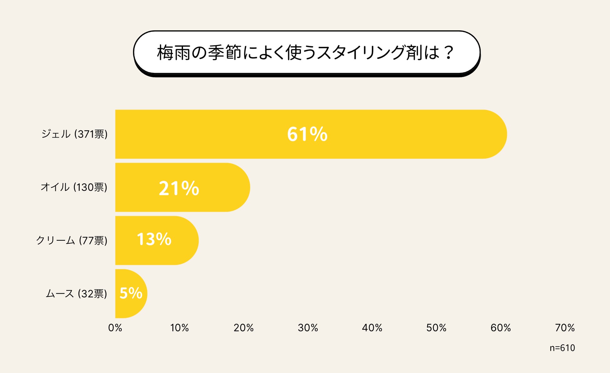 これらのケア方法からも、多くの方が梅雨時の湿気対策として、スタイリング剤や保湿に重点を置いていることが分かります。