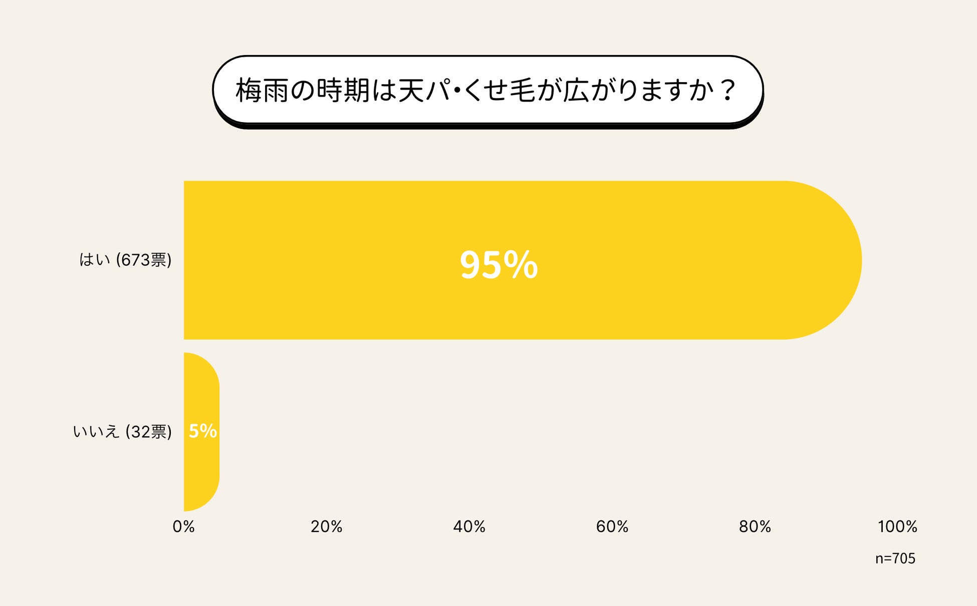 今回実施したアンケート調査によると、ほとんどの方が梅雨時に髪の悩みを抱えていることが明らかになりました。多くの方が梅雨の湿気でくせ毛や天パが広がると感じていることようです。