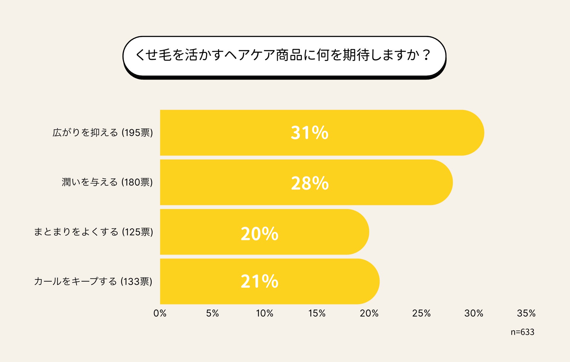 また、くせ毛を活かすヘアケア商品に対して、多くの方が広がりを抑えることを期待しており、次いで潤いを与えることやカールのキープが求められています。これらの結果は、くせ毛を活かしつつ、湿気による広がりや乾燥を防ぐヘアケア商品の必要性を強調しています。