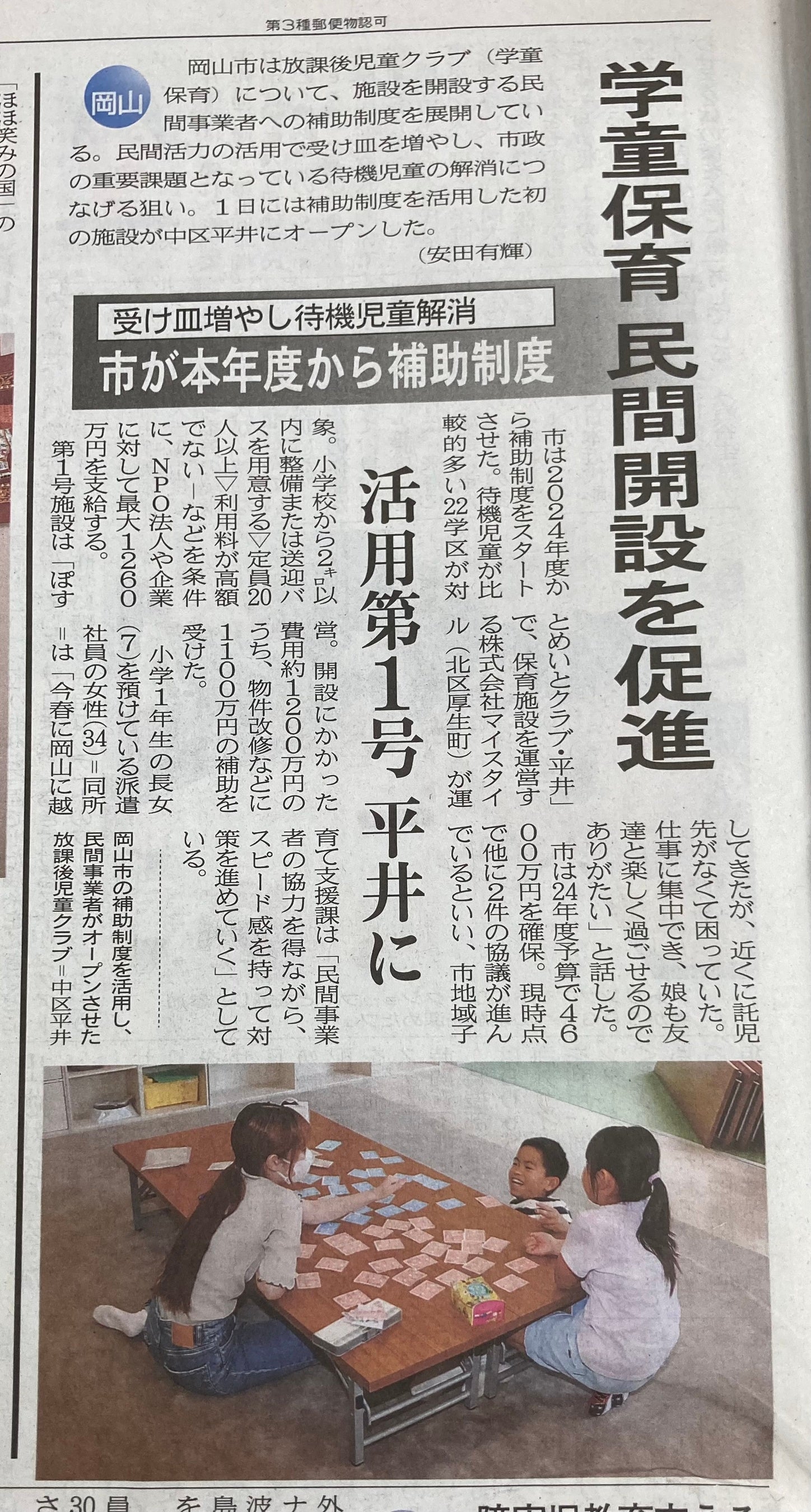 岡山市が放課後児童クラブ設置を支援、株式会社マイスタイルが「ぽすとめいとクラブ・平井」を開設