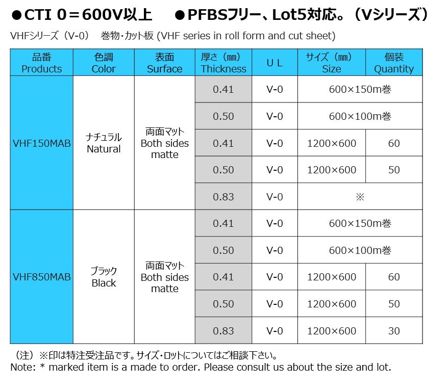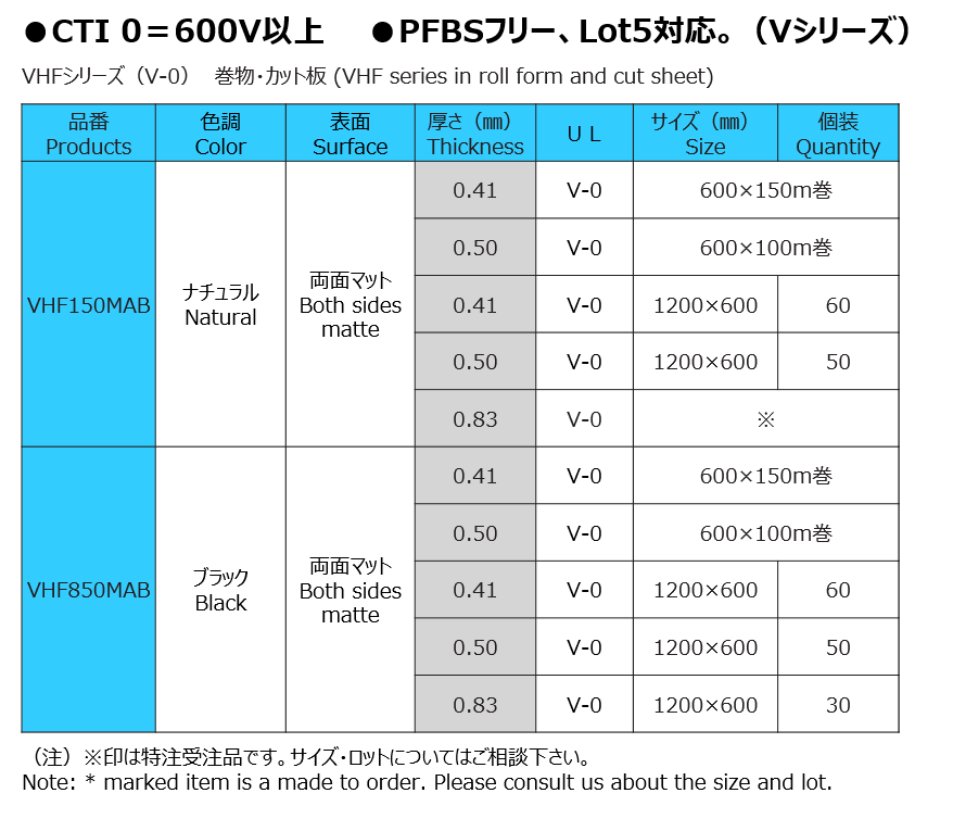 それにともない電源関連システム、高電圧製品向けに耐トラッキング性能の高い絶縁材料のニーズは高まっており、標準規格厚さは0.41mm~0.83mm。顧客の要望により耐トラッキング性を維持し0.41mmより薄い仕様、も対応可能です。また、更なる高耐トラッキング性の開発を進めております。