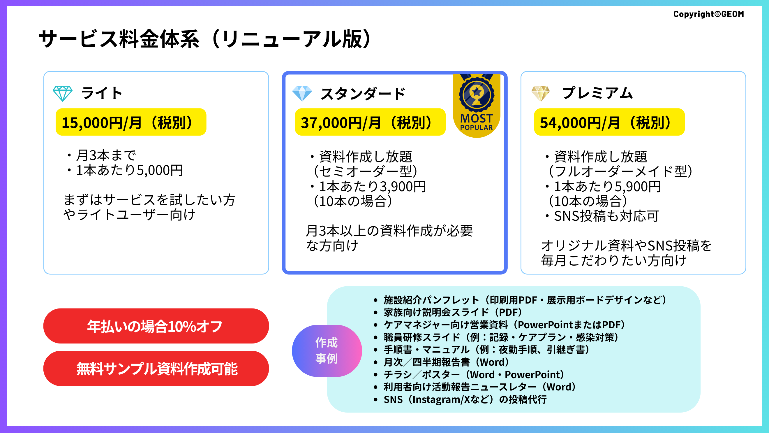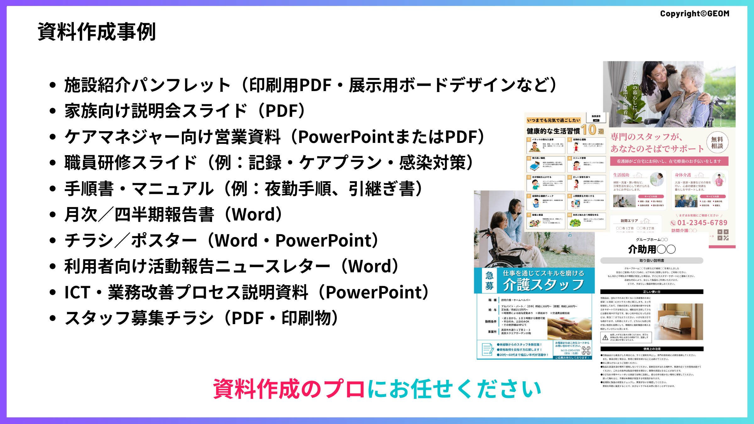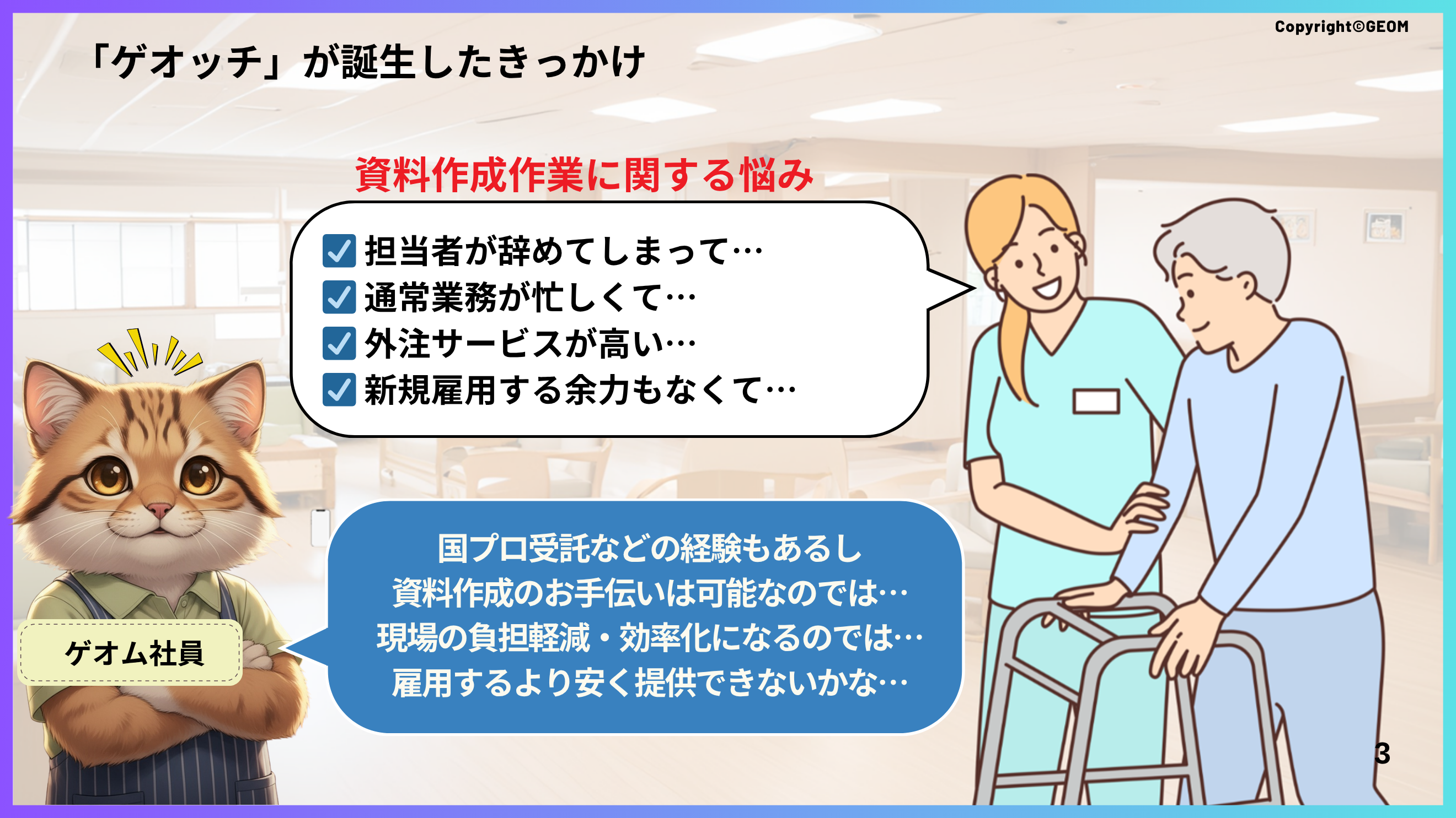 2024年9月、ゲオム株式会社は資料作成代行サービス「ゲオッチ」の販売を開始しました。当初は介護事業者の既存資料ブラッシュアップ作業がサービスの中心でした。販売開始から約1年が経過する中で、お客様からの要望を集約・検証し、業務に関するヒアリングを実施。この度、これらの結果をもとに介護事業者に特化したサービス内容・価格帯に整備し、より活用しやすい形にリニューアルしました。