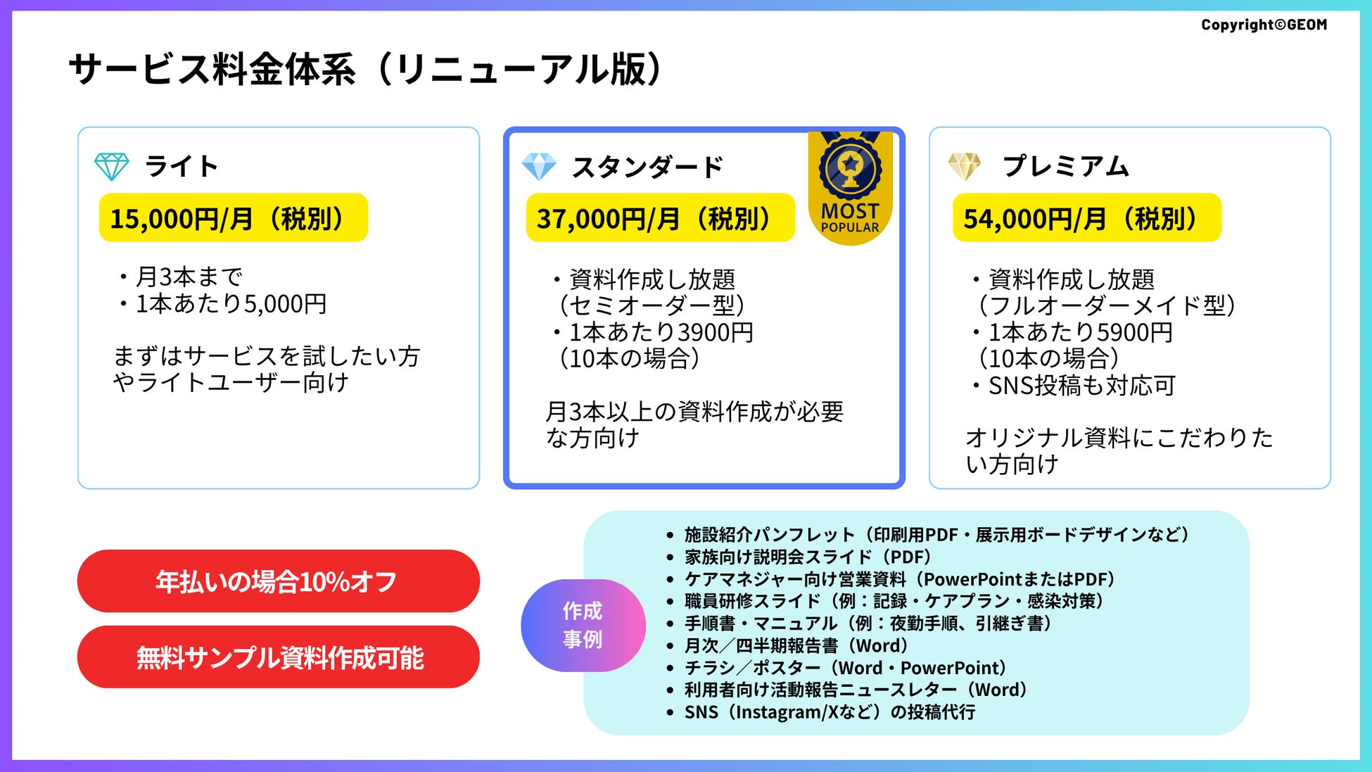 2024年9月、ゲオム株式会社は資料作成代行サービス「ゲオッチ」の販売を開始しました。当時は介護施設の既存資料ブラッシュアップ作業がサービスの中心でした。販売開始から約1年が経過する中で、介護施設のお客様からの要望を集約・検証し、業務に関するヒアリングを実施。この度、これらの結果をもとに介護施設に特化したサービス内容・価格帯に整備し、より活用しやすい形にリニューアルしました。